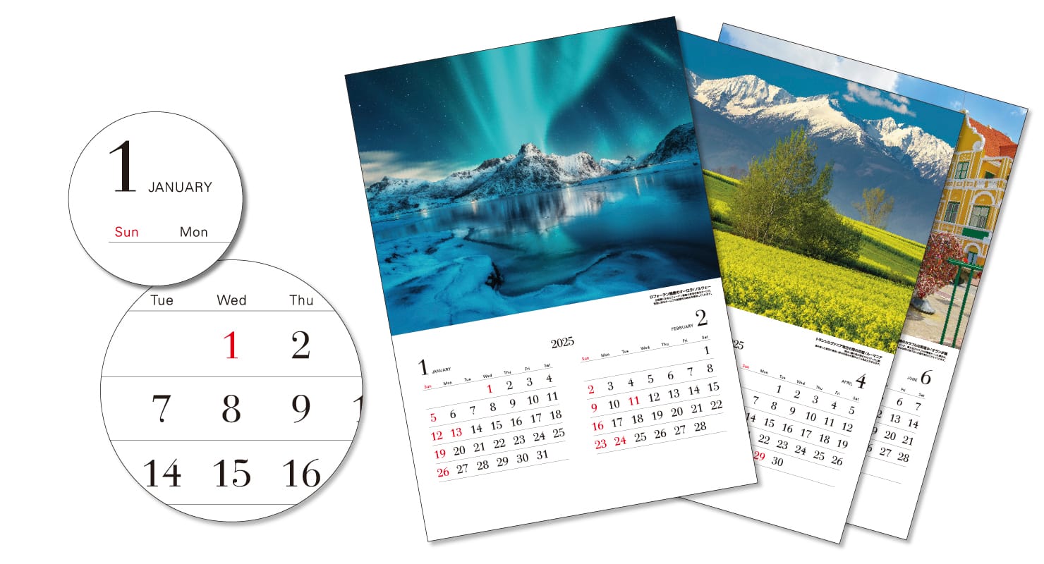 弊社が企画しておりますフイルムカレンダーは、紙素材のカレンダーとは味わいが異なるフイルム素材を活かした美麗な色彩再現となっております。