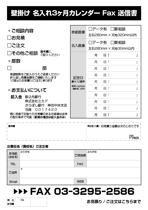 ※大部数、完全オリジナルデザインデータ支給の3ヶ月カレンダーをご希望の場合はご相談ください。