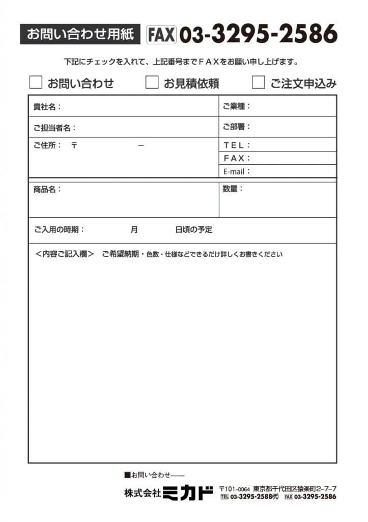 お見積り、ご注文、お問い合わせについては、画像のFax送信書をプリントしていただき、必要事項をご記入の上ご連絡ください。(メール可)ご提供価格を折り返しご連絡いたします。